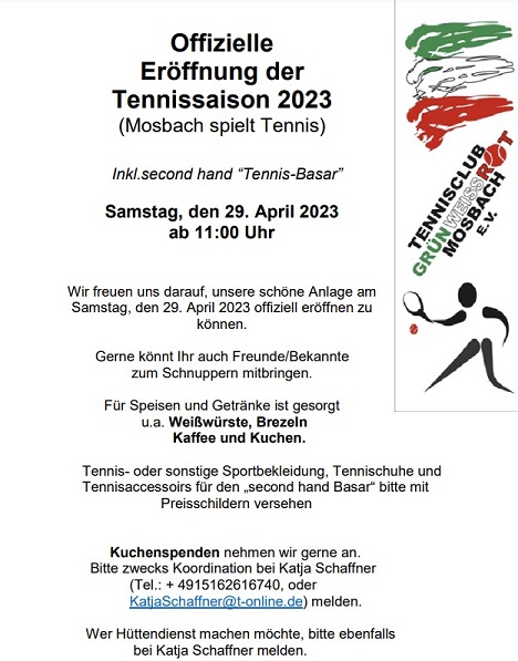 Unsere Außenplätze werden aktuell vorbereitet und vermutlich ab der KW 16 schrittweise geöffnet; je nach Wetter und Zustand. Eine separate Info-email folgt, sobald der erste Freiplatz geöffnet ist. Die Verfügbarkeit der Plätze ist auch in der Platzbuchung (https://platzbuchung.tc-mosbach.de) zu sehen.